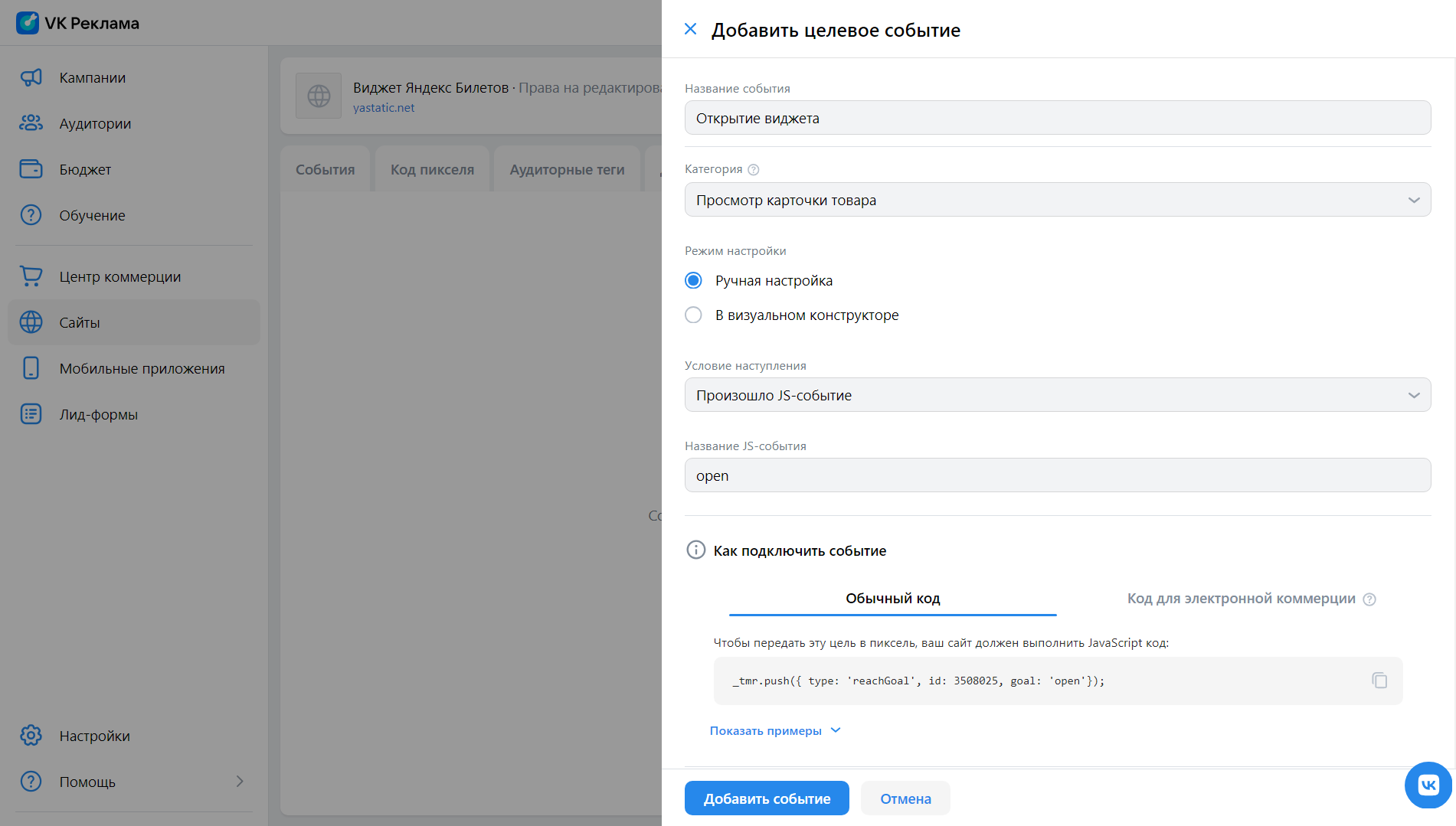 Пиксель ретаргетинга — это код для отслеживания действий посетителей вашего сайта или виджета. Он позволяет показывать рекламу пользователям VK с учетом того, какие сайты они посещают и какие действия выполняют.