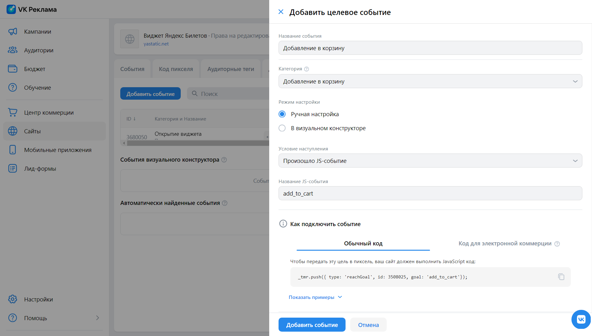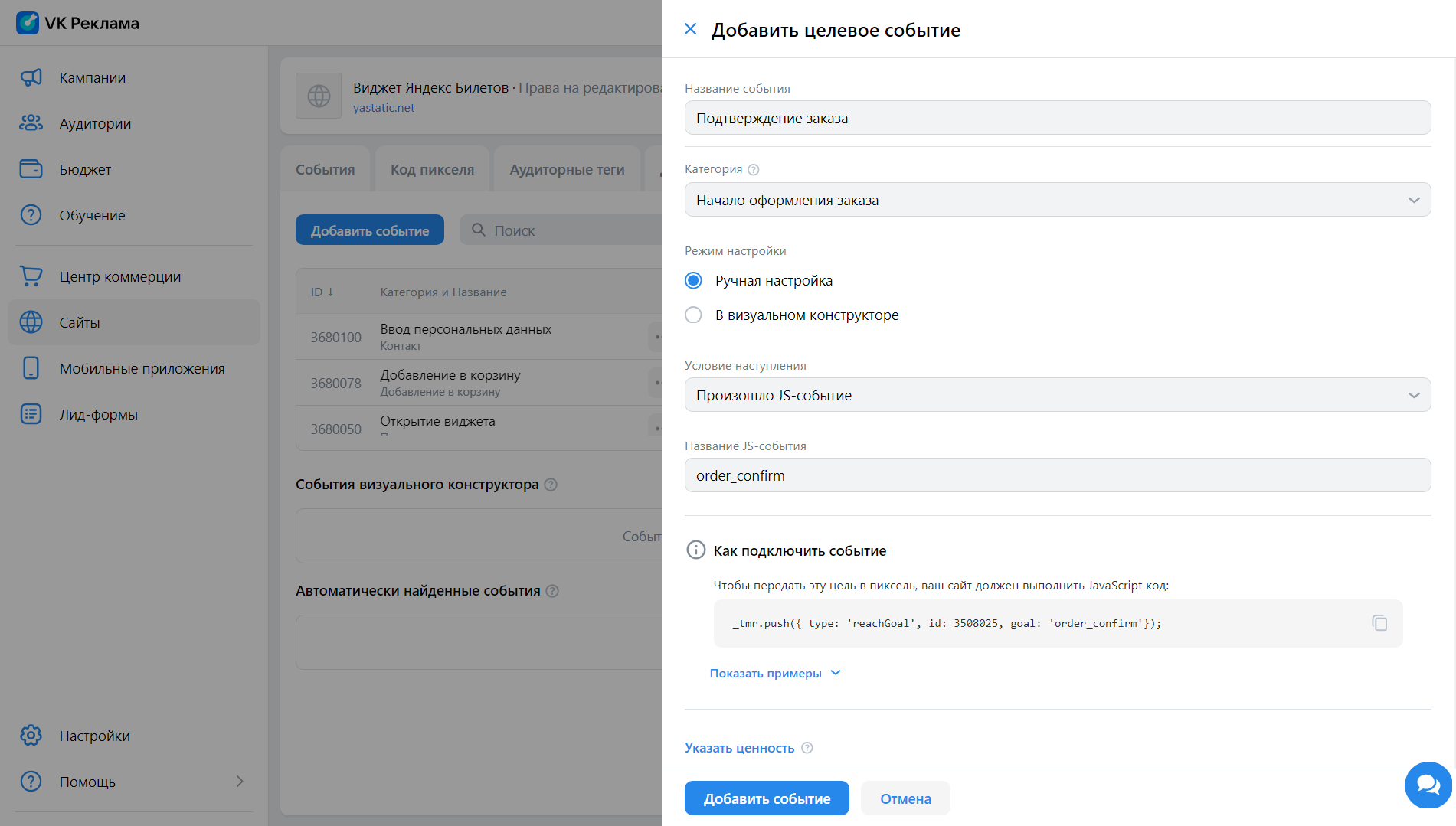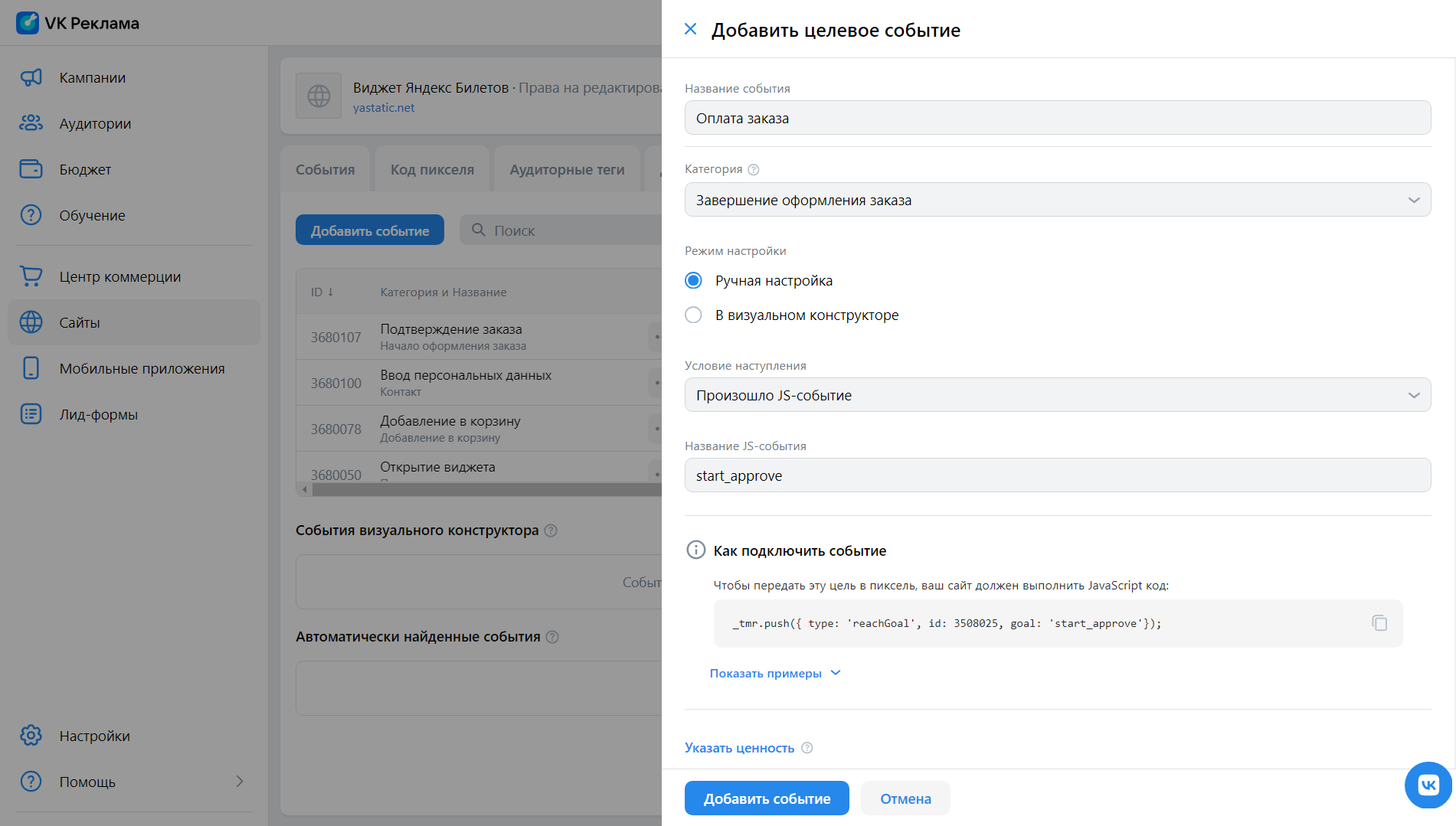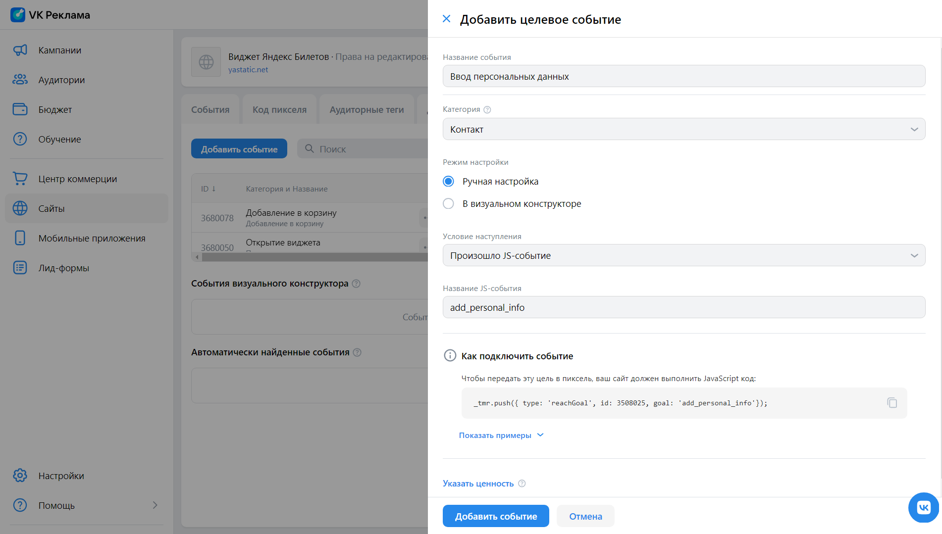 - Чтобы получать данные только по конкретному событию, создайте отдельный пиксель и передайте его номер и название события в службу поддержки.
