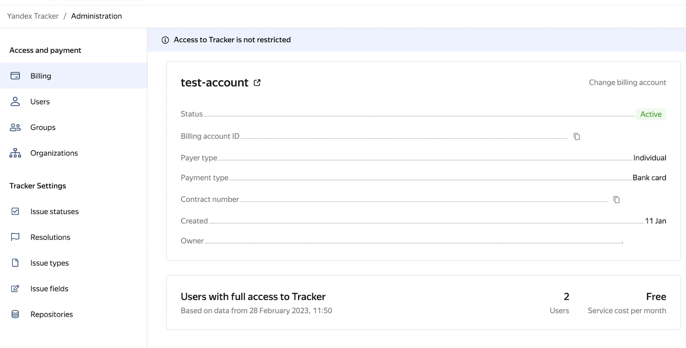 You need a Yandex Cloud billing account to pay your invoices for using Yandex Tracker if full access to the platform is granted to six or more users. Your billing account linked to Yandex Tracker will be debited monthly for using the service.