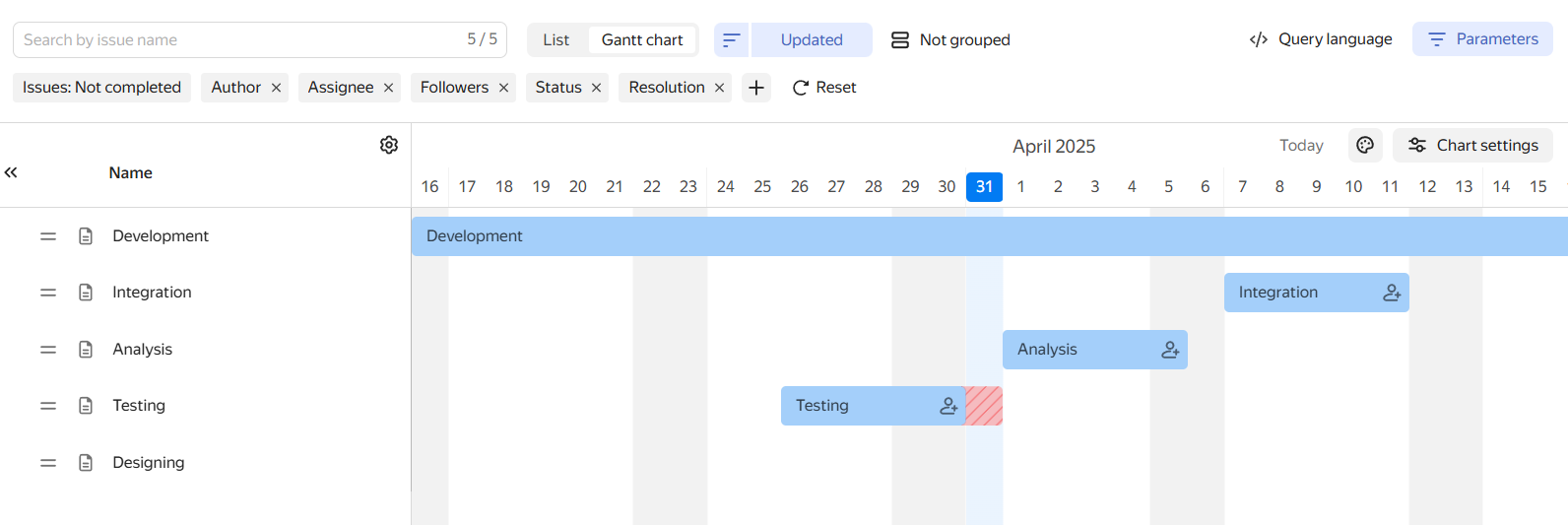 The deadlines of issues are shown on the chart as bars plotted along the time axis. The left edge of each bar indicates the start date of work on the issue, while the end of the bar shows its deadline. If a task is not closed by the deadline, the bar turns red.