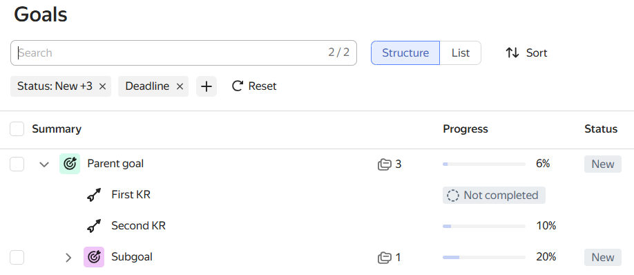 When filters are active, their effect extends to both parent and child goals in the Structure view. For example, if a parent goal doesn't match the filters, neither it nor its child goals will appear in the list.