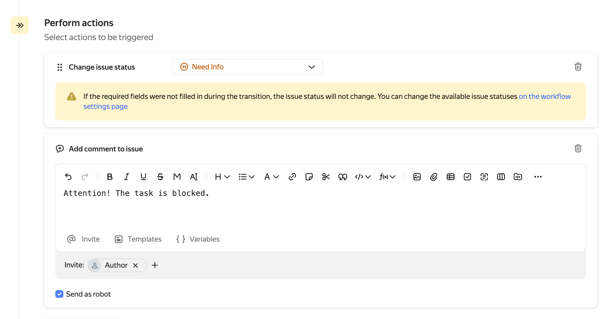 Enter the comment to be displayed to the issue author and choose Send as robot. Otherwise, the comment is sent on behalf of the user who initiates the trigger action by adding the link.