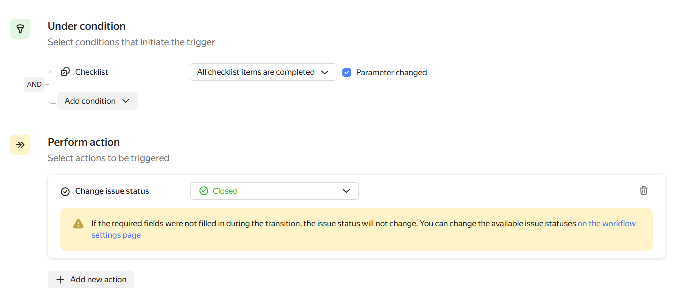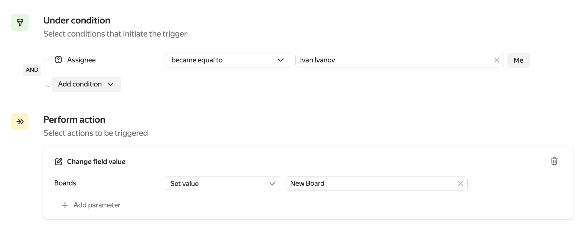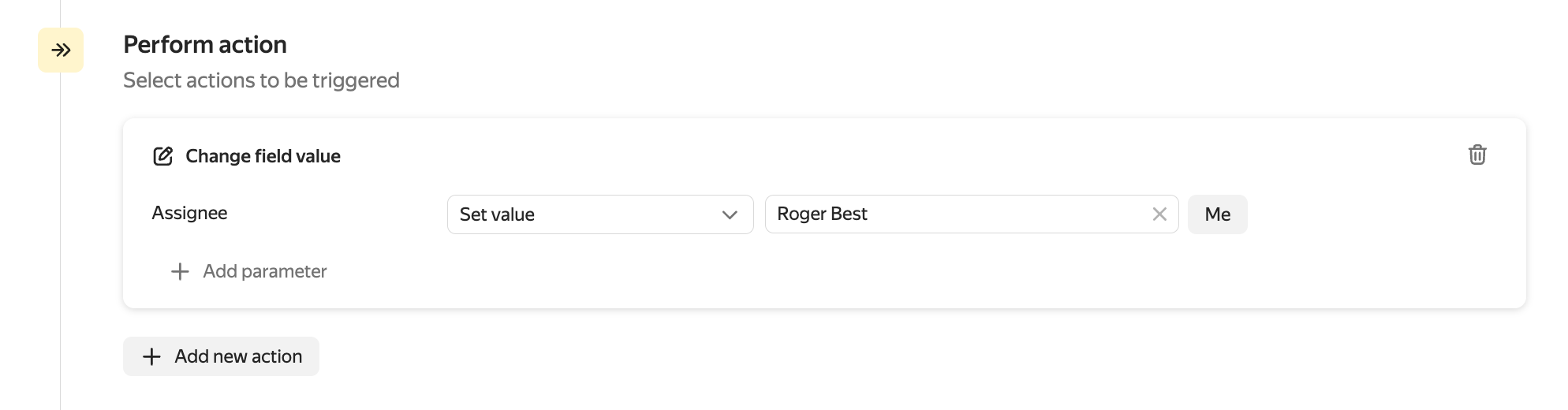 It might often be the case that different employees are assigned to perform specific work stages. When an employee has completed their part of the work, they hand over the issue to the next assignee. If a team uses Yandex Tracker, there's an issue status for each stage of work. When the issue switches over to a certain status, you can use a trigger to automatically set the assignee for the next work stage.