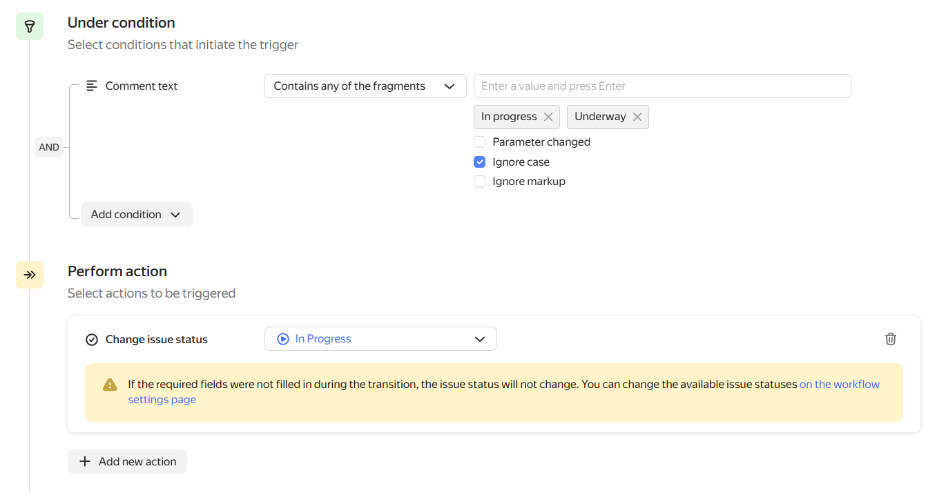 Set the trigger action: in the list of actions, select Change issue status → In progress.