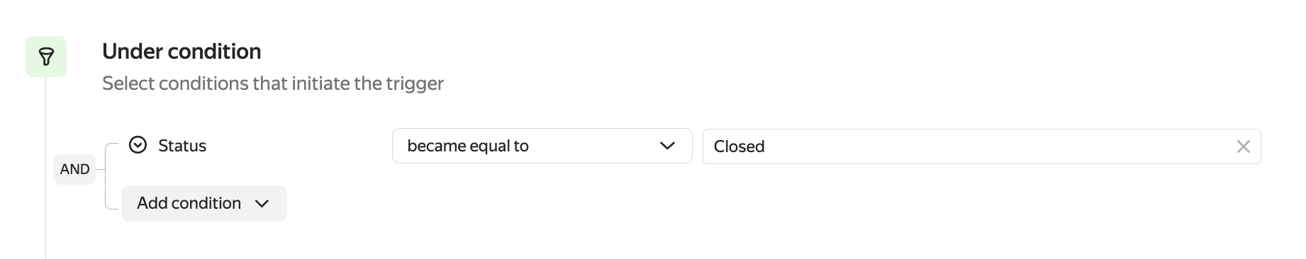 - Add the condition Status → Field value became equal to → Closed. The available statuses depend on the workflow set up for the queue.