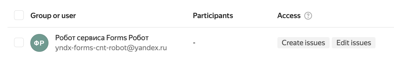 To embed the form correctly, grant the yndx-forms-cnt-robot@ robot access to the queue. To learn more about setting up access, see Setting access rights for queues.