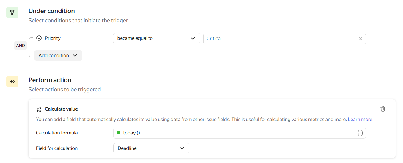 Let's set up a trigger to automatically calculate the difference between dates in Yandex Tracker: