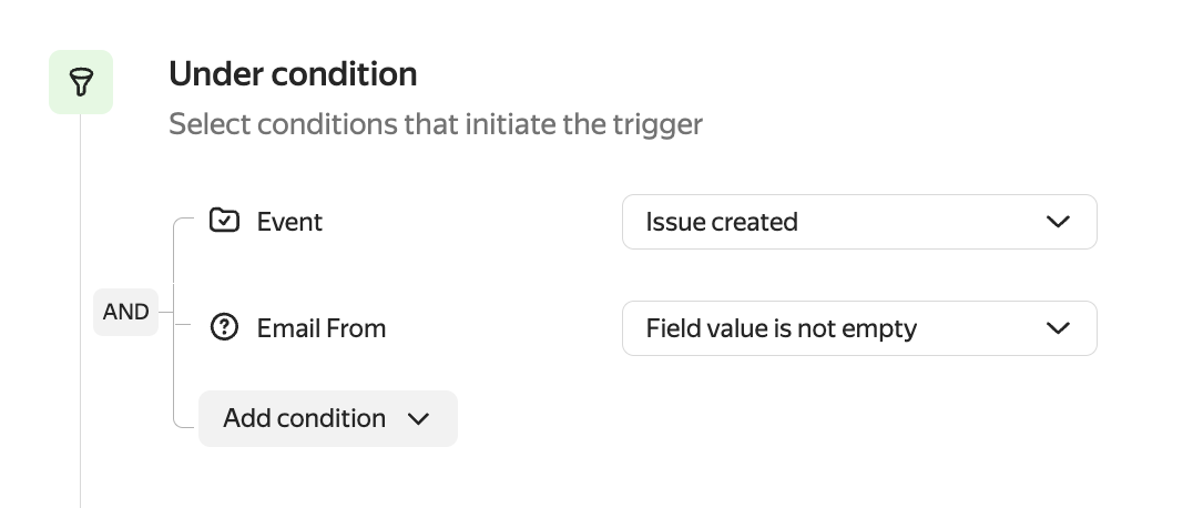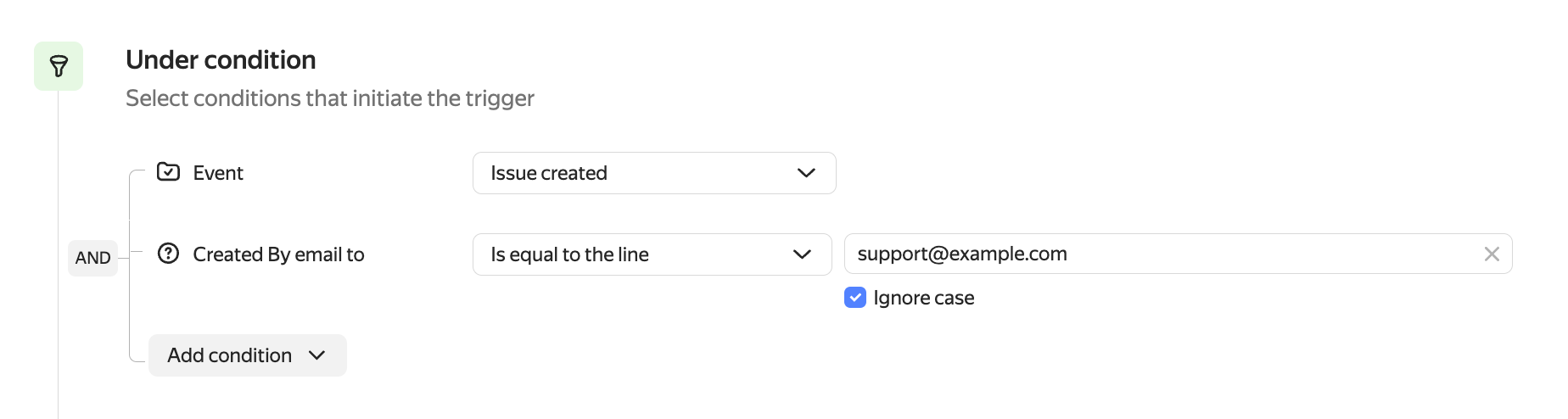 Set up the conditions to fire the trigger when an issue is created based on an incoming email: