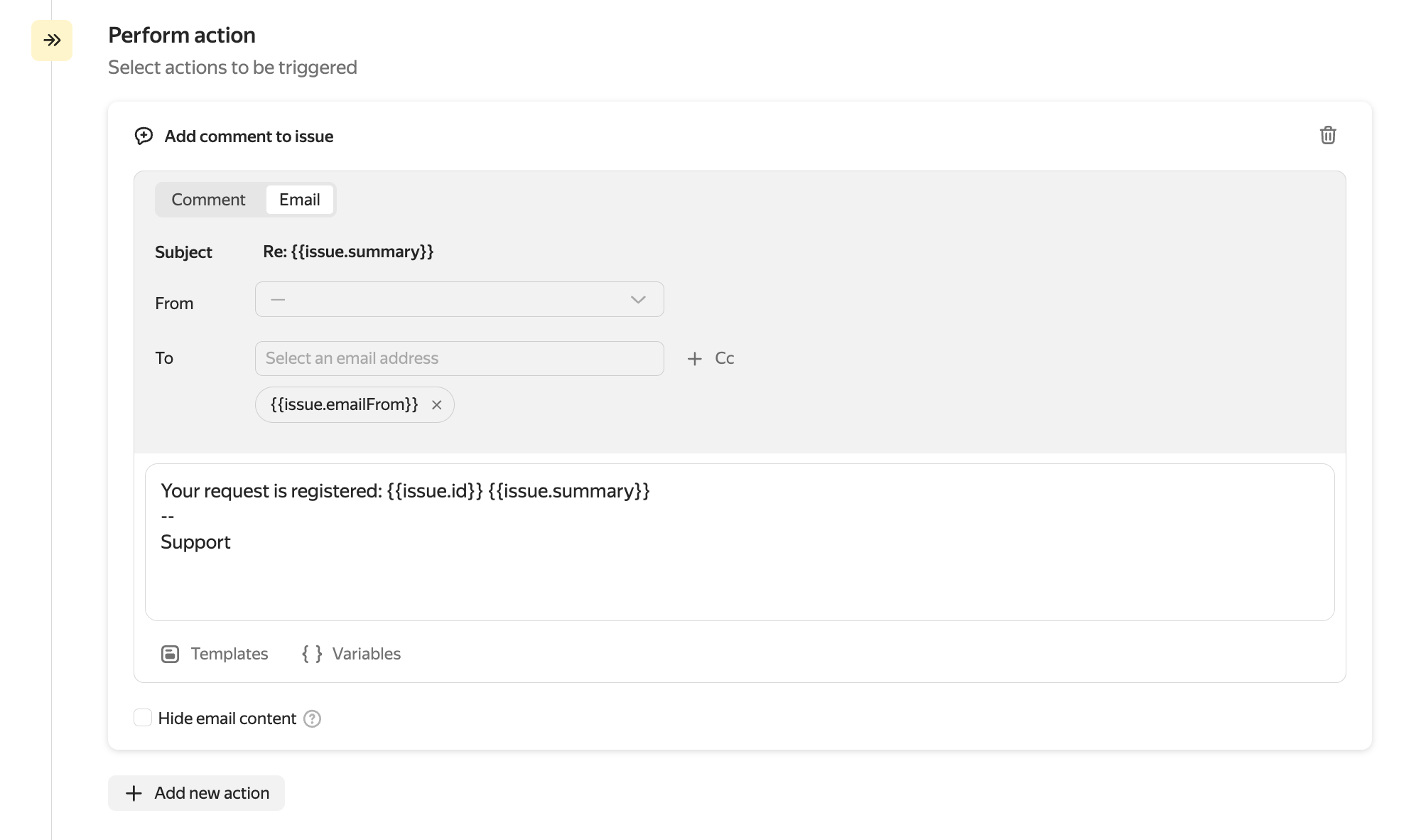 In the To field, add the variable with the address of the user who sent the request. To do this, select the Email To field, click Add variable, and choose Email → Email From.