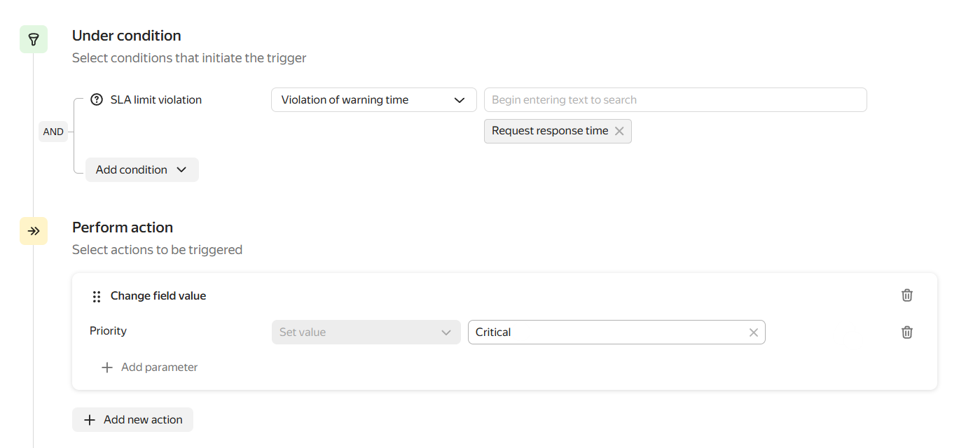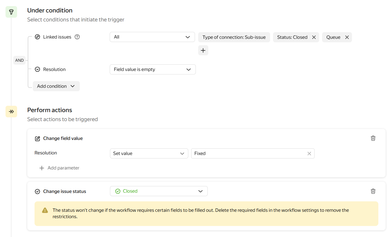 For example, we have a trigger that updates the status, priority, and adds a comment in related issues. Using a trigger and Yandex Tracker API, you can configure automatic update of related issues: