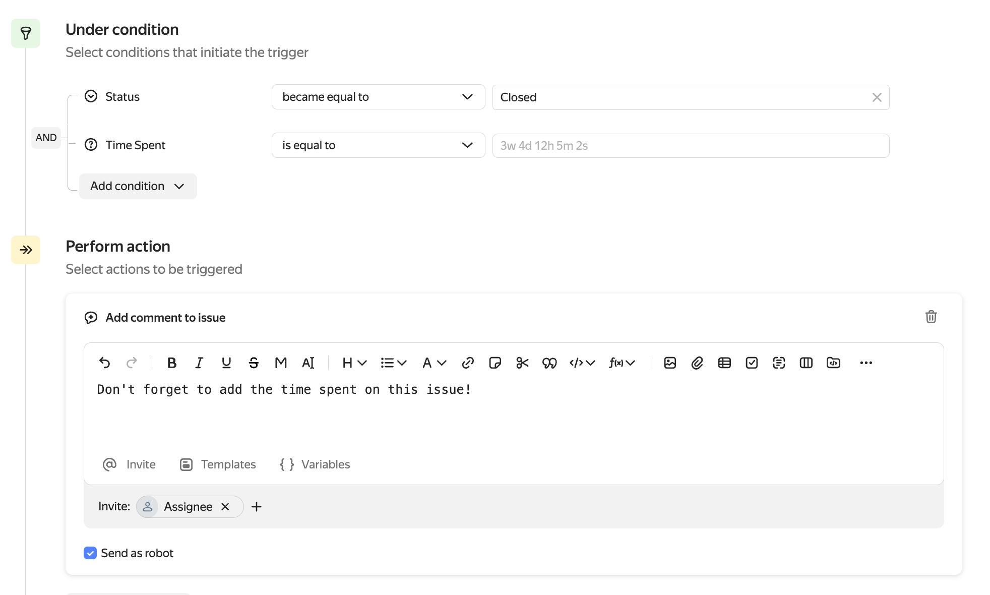 Having completed the issue, the employee might forget to specify some important information, for example, the time spent. In this case, you can set up a trigger that will automatically summon the user if the issue was closed, but the time spent was not specified.