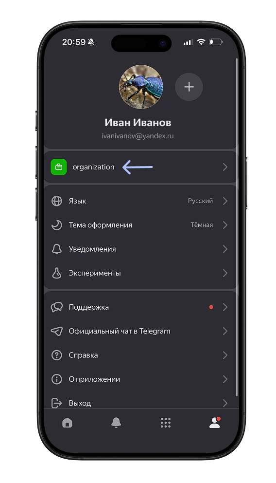 If your Yandex account is associated with multiple organizations, you'll see the last one you used. To switch to a different organization: