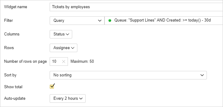 To get statistics about how many issues were assigned to your employees over the past 30 days, add the widget with the following table to your dashboard: