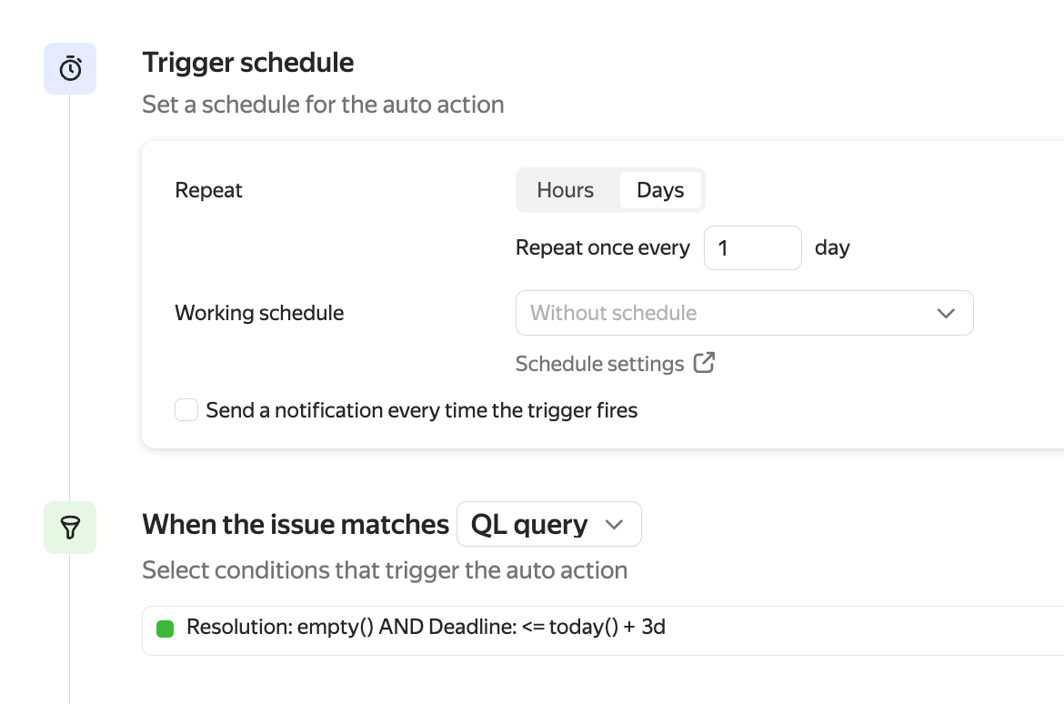 Set up the condition so that the auto action is triggered on non-resolved issues (without a resolution) if the deadline is in 3 days or less. To do this, go to When the issue matches, select QL query, and set a condition in the query language: