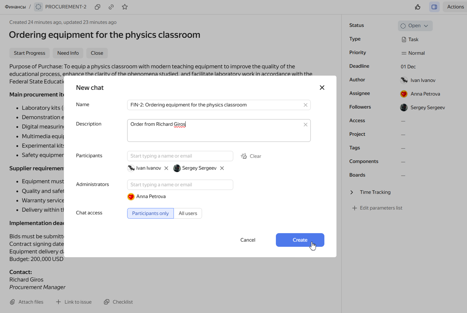 Employees only: Only users you added through the Yandex Tracker interface will have access to the chat.