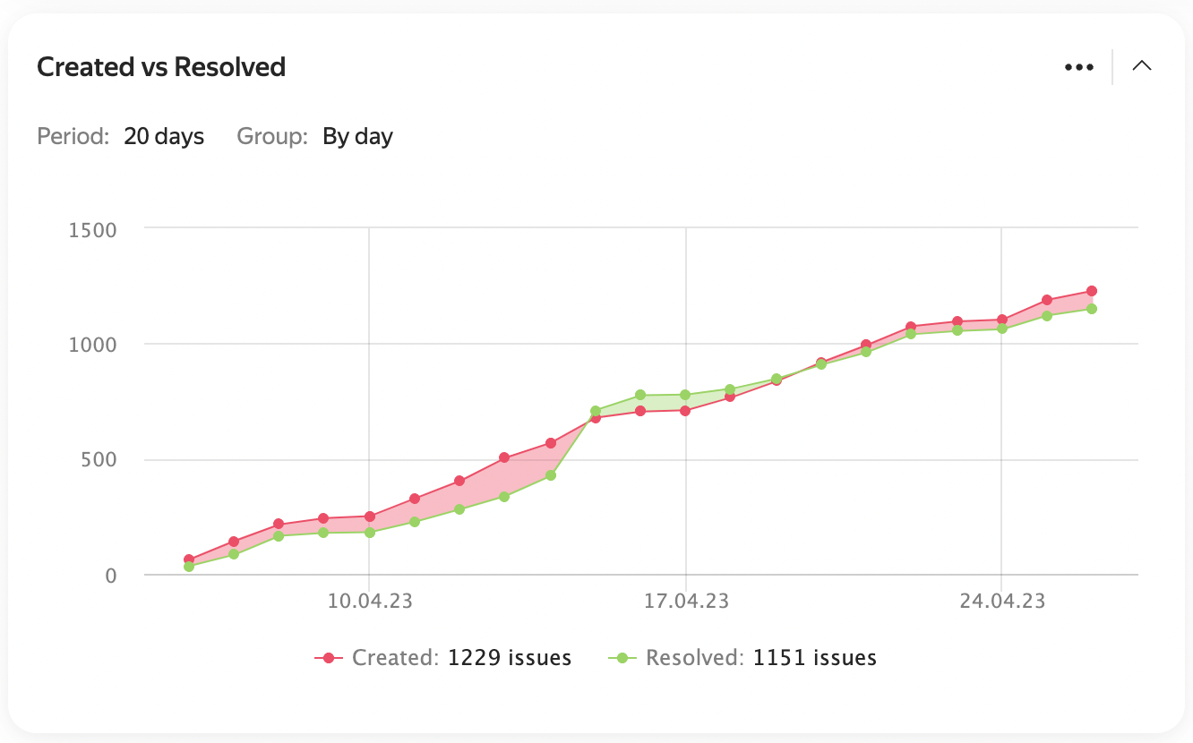 The chart enables you to compare the number of created and closed issues. You can specify the period and step for collecting statistics.