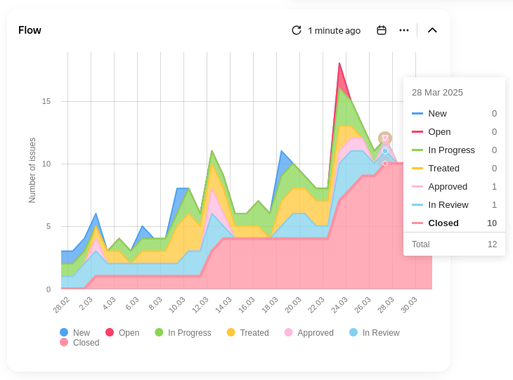 With the Flow widget, you can build a chart and see the number of issues in different statuses distributed across time intervals.