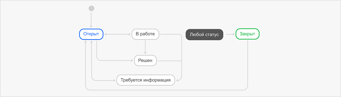 В Трекере каждому этапу выполнения задачи соответствует свой статус. Например: «Открыт», «В работе», «Тестируется», «Закрыт». Чтобы перенести рабочий процесс в Трекер, нужно настроить рабочий процесс — набор статусов, через которые проходит задача на пути от создания до решения, и правила перехода между статусами.