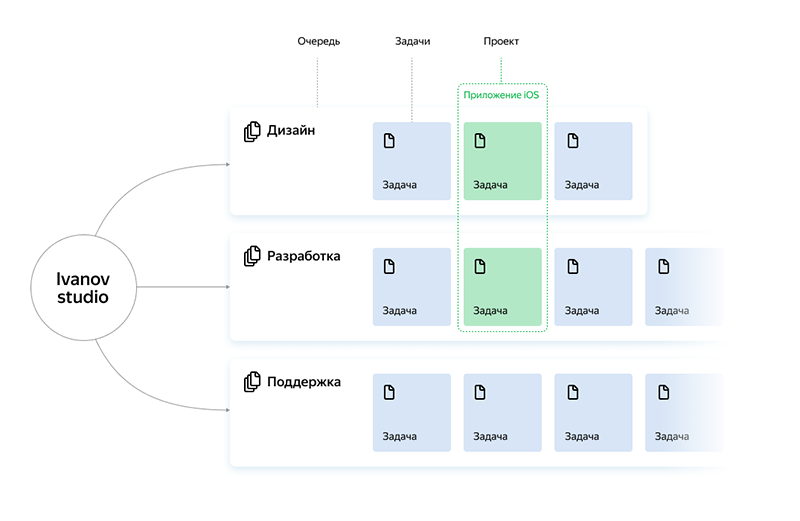 Как правило, у каждой команды свой рабочий процесс, поэтому мы рекомендуем создавать отдельные очереди задач для команд или подразделений компании. Вы можете создать очереди для отдела разработки, группы дизайна и юридического департамента. Тогда очередь станет потоком задач, которые выполняет определенная команда. Например, если вам нужно разработать новый дизайн логотипа, создайте задачу в очереди дизайнеров.