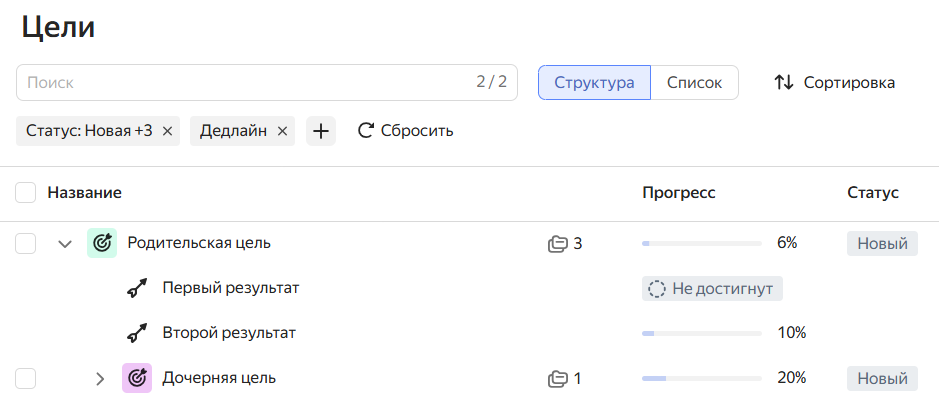 Если в списке настроены фильтры, в представлении Структура действие фильтра распространяется как на родительские, так и на дочерние цели. Например, если в фильтр не попадет цель верхнего уровня, она не отобразится в списке вместе со всеми дочерними целями.