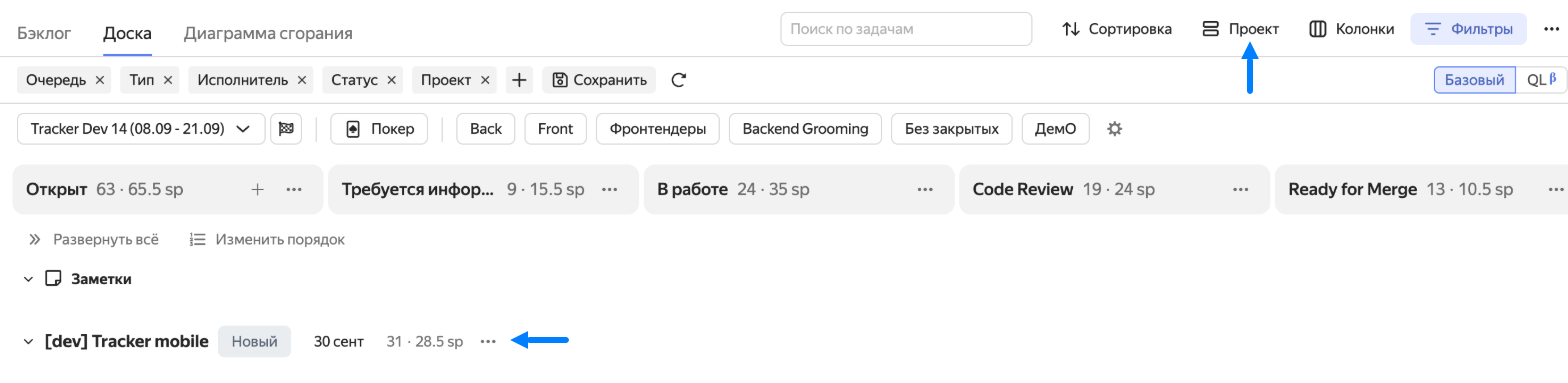 В верхнем правом углу нажмите Фильтры. Над колонками доски отобразится панель для настройки фильтра.