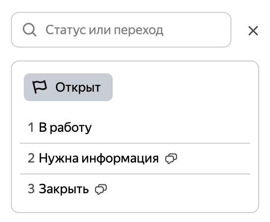 Теперь пользователям Трекера в задачах доступен просмотр рабочего процесса очереди. Если у пользователя есть права на просмотр задач очереди, то он сможет увидеть в задаче набор статусов. Также пользователь сможет посмотреть переходы, но только те, которые ему доступны в рамках настроенного процесса.