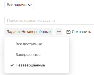 В списке задач появился неудаляемый фильтр «Задачи», который позволяет отображать все доступные, незавершенные или завершенные задачи. Задача считается завершенной, если она находится в статусе с типом Завершен или Отменен и/или у нее есть резолюция.