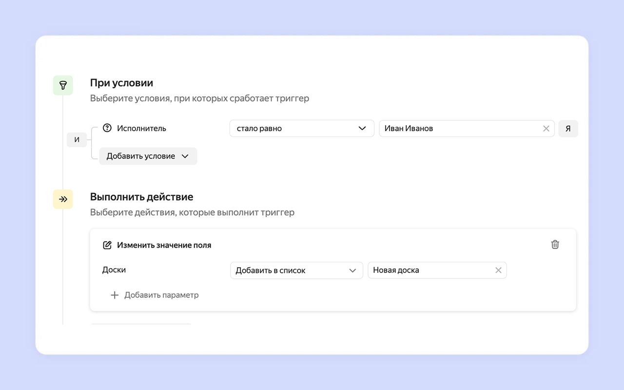 Редактировать автоматизации стало проще и быстрее: условия и действия автоматизации теперь визуально разделены на блоки, а самые популярные настройки доступны в один клик. Также с помощью триггера теперь можно добавить задачу в активный спринт доски.