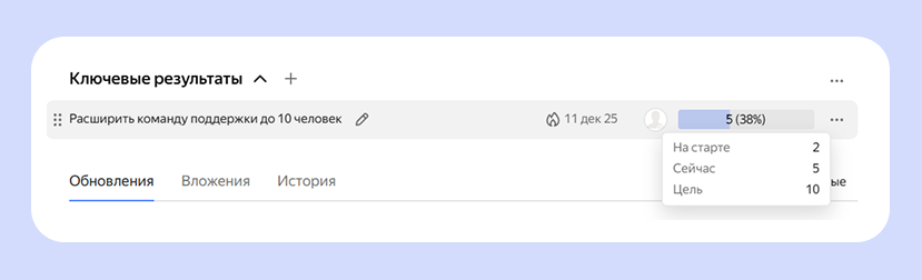 Измерение ключевых результатов Цели стало более гибким. Теперь можно не только отметить факт выполнения результата, но и задать для него числовые метрики: начальное, текущее и целевое значения. Также новый способ измерения позволяет наглядно отслеживать достижение ключевого результата на полосе прогресса: для этого при создании цели выберите Способ измерения → Значение.