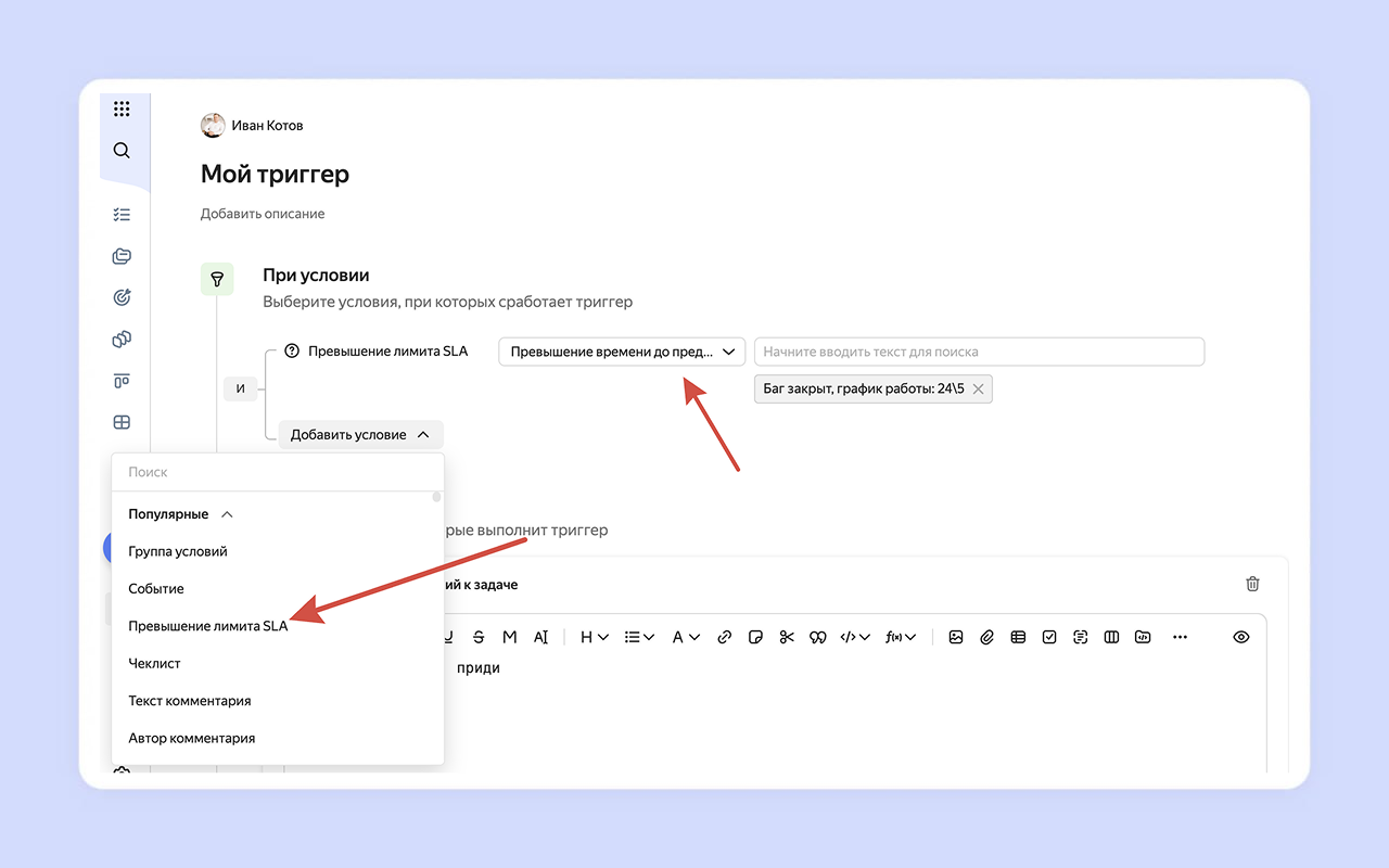 Если в вашей очереди настроены таймеры SLA, вы можете использовать их как условие для запуска триггера в задаче. Для этого в настройках триггера выберите условие Превышение лимита SLA.