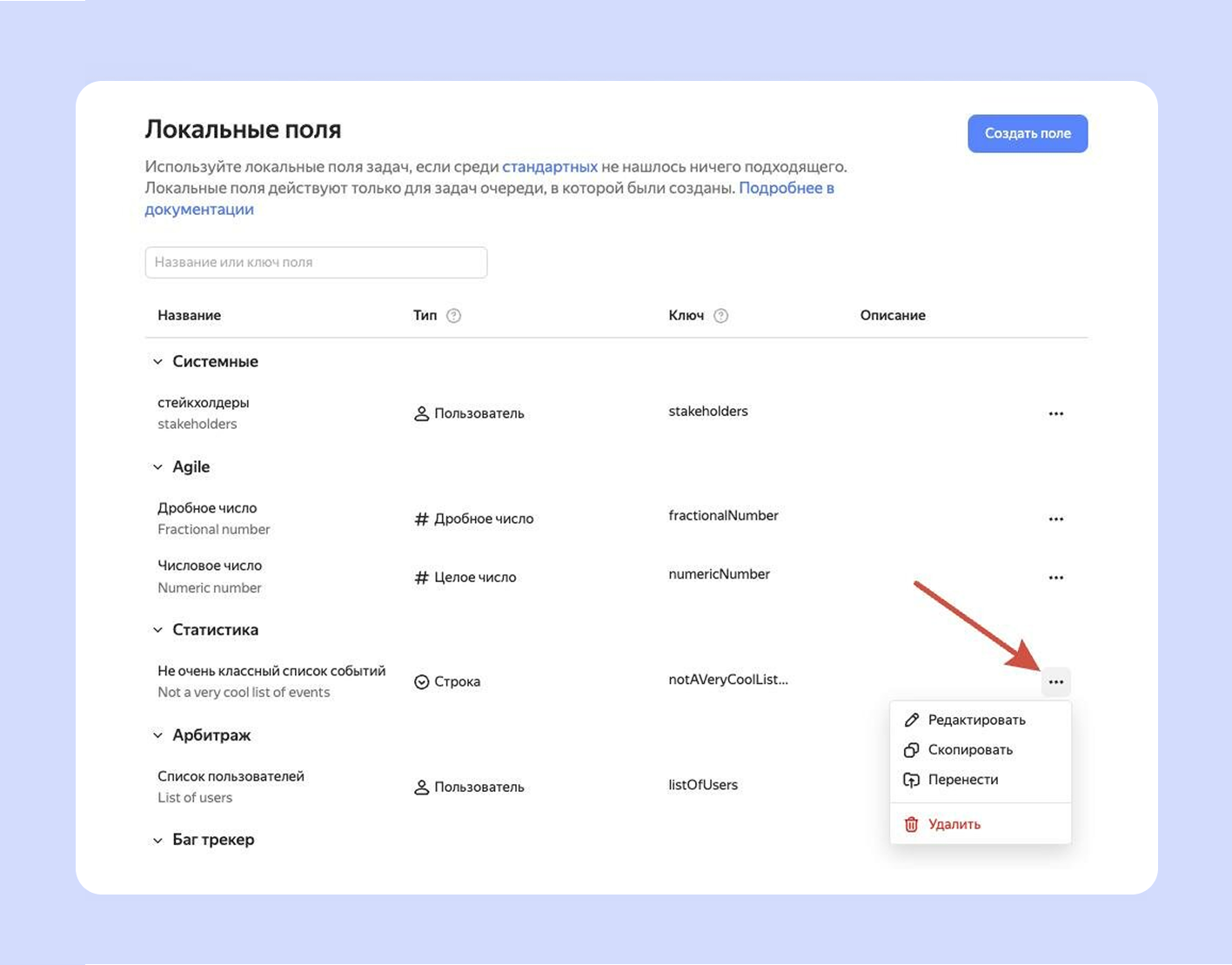 В настройках очереди и в списке полей Яндекс Трекера появилось меню действий с глобальными и локальными полями. Теперь поле можно скопировать, отредактировать или удалить без использования HTTP-запросов. Подробнее о новой возможности читайте на страницах: