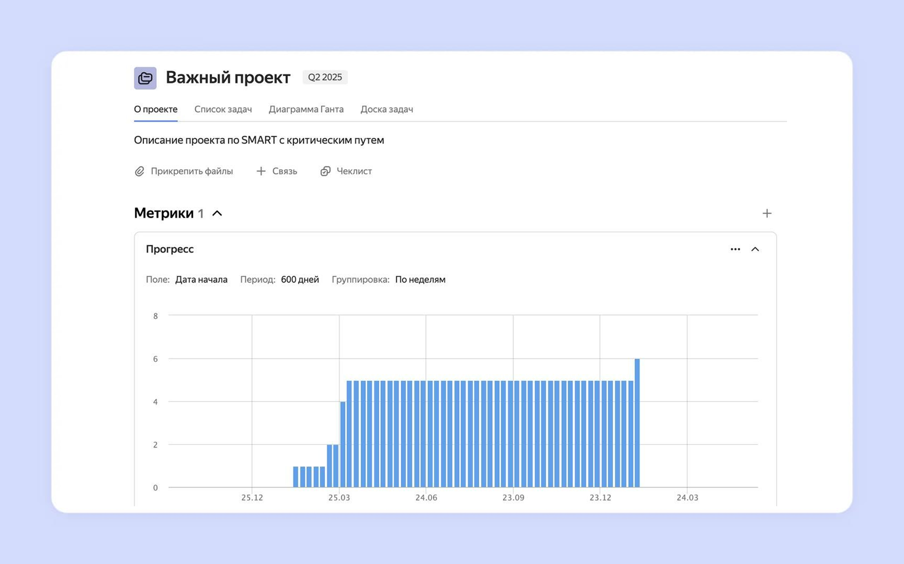 Теперь можно встроить виджет Трекера на страницу проекта, портфеля или цели. Все изменения будут отображаться на странице в отдельном блоке Метрики.