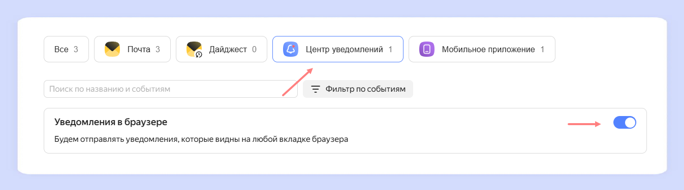 Теперь вы можете получать оповещения о событиях в ваших задачах прямо в браузере. Для этого на странице Уведомления выберите канал Центр уведомлений и включите опцию Уведомления в браузере.