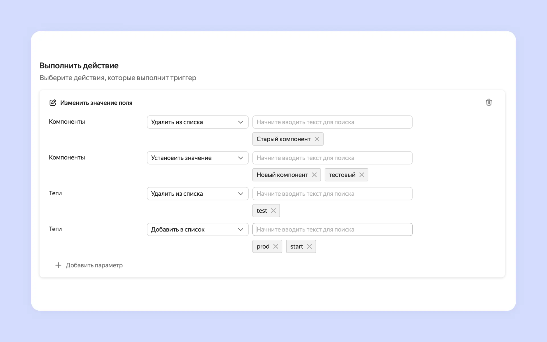 Раньше, чтобы триггер удалил один тег или компонент задачи и добавил другой, нужно было настраивать два отдельных действия. Теперь обе эти операции можно объединить в одном действии триггера.