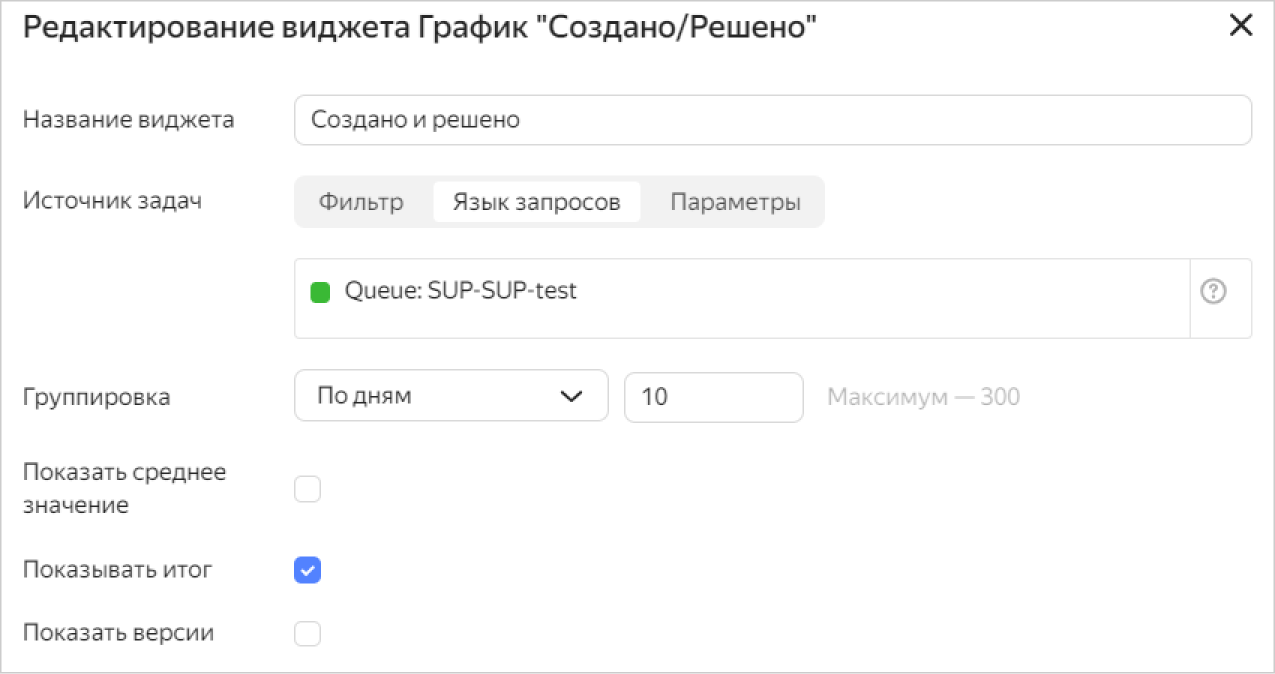Чтобы отображать на графике общее количество созданных и решенных обращений, включите опцию Показывать итог.
