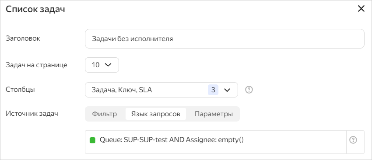 Чтобы сотрудники службы поддержки могли быстро найти обращения, у которых нет исполнителя, и взять их в работу, добавьте на дашборд список таких задач: