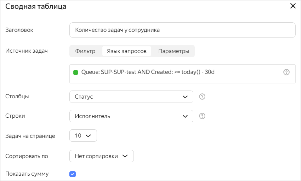 Чтобы получить статистику о том, какое количество задач было назначено на сотрудников за последние 30 дней, добавьте на дашборд виджет с таблицей: