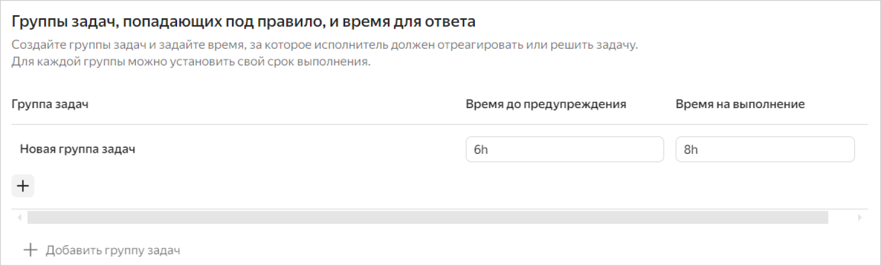 Чтобы настроить разное допустимое время ответа для отдельных групп задач, нажмите кнопку Добавить группу задач и введите другие значения времени для новой группы.