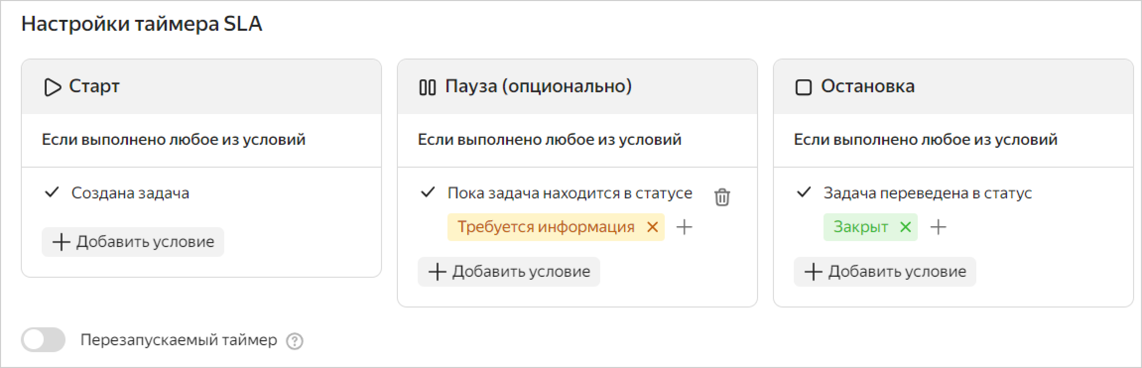 В разделе Пауза добавьте условие Пока задача находится в статусе → Требуется информация.