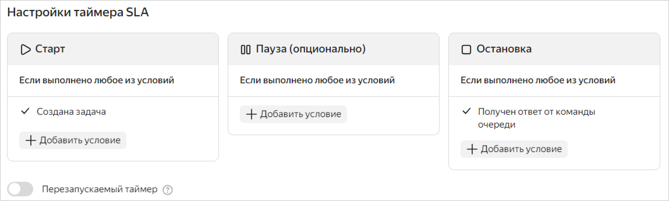 Чтобы контролировать время обработки обращений в Трекере, настройте правила SLA для задач вашей очереди. В правиле можно задать допустимое время обработки задачи и настроить таймер, который запускается и останавливается при наступлении определенных событий, например при создании задачи, изменении статуса, назначении исполнителя и так далее.
