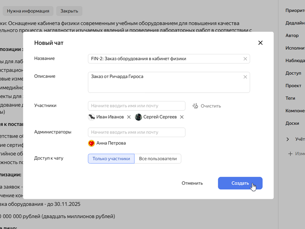 Чтобы оперативно обсуждать вопросы с командой и не потерять информацию при работе над задачей, создайте чат по задаче в Яндекс Мессенджере . Ссылка на чат отобразится в интерфейсе задачи.