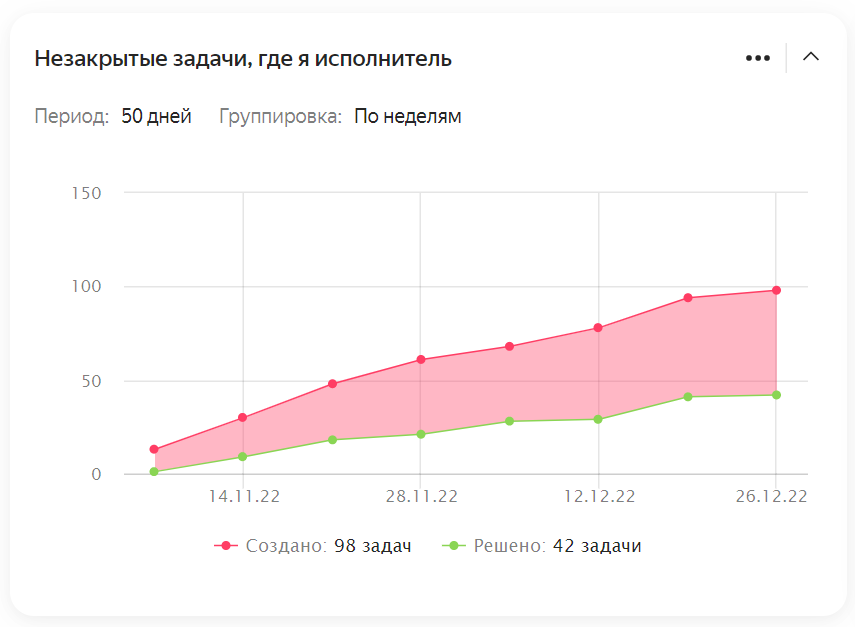График позволяет сравнить количество созданных и закрытых задач. Вы можете указать период и шаг для сбора статистики.