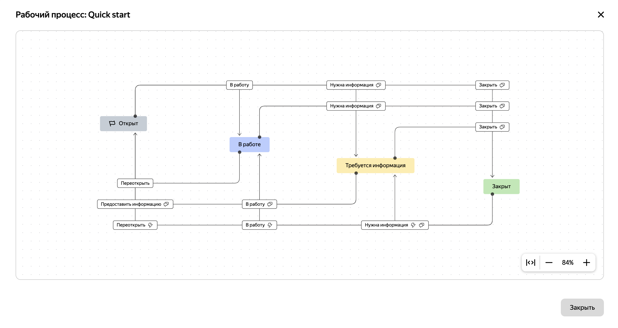 Трекер позволяет просматривать рабочий процесс очереди прямо на странице задачи. Если у пользователя есть права на просмотр задач очереди, то он сможет увидеть набор статусов, а также посмотреть переходы, но только те, которые доступны в рамках настроенного процесса.