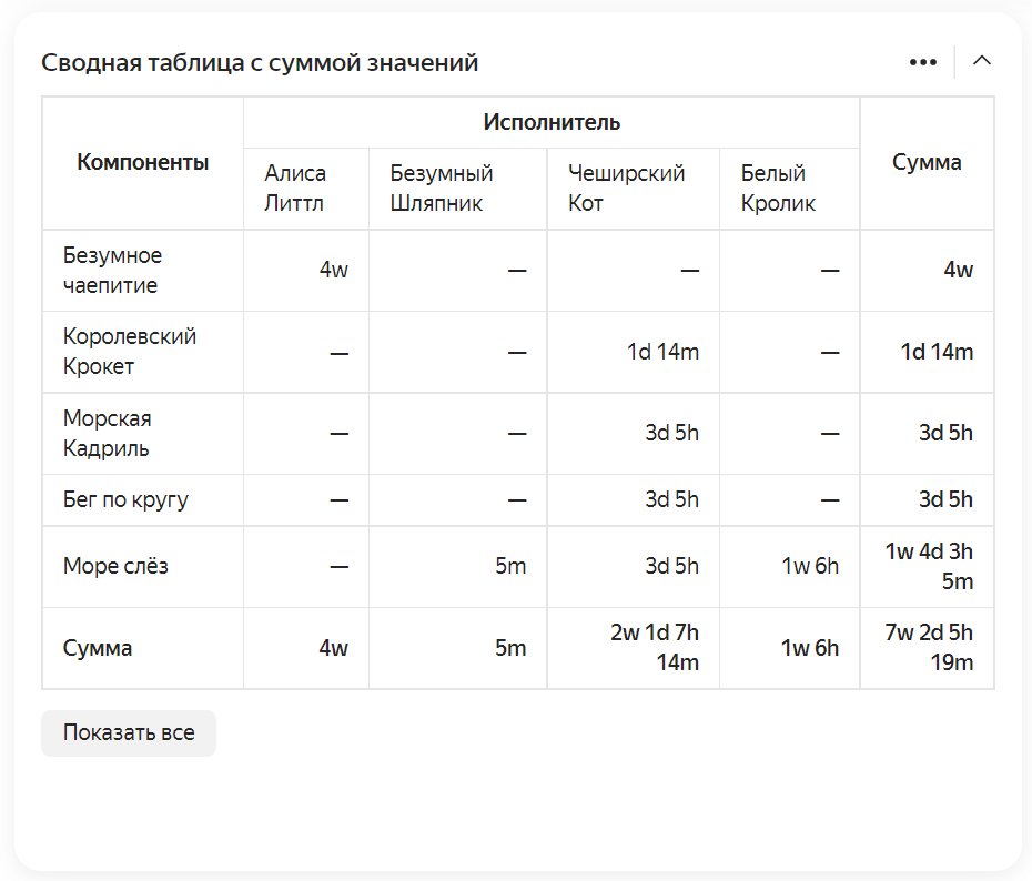 Особый вид сводной таблицы по двум параметрам. В отличие от простой сводной таблицы, на пересечениях приводится не число задач, а сумма значений третьего параметра. С помощью такой таблицы вы можете, например, отслеживать время, которое исполнители затратили на работу над различными компонентами очереди.