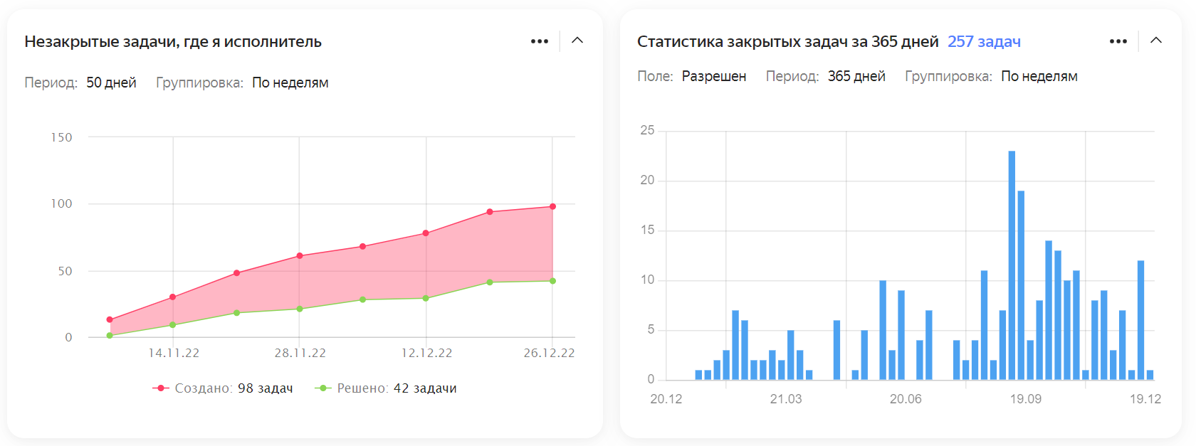 Виджеты — это небольшие карточки с полезной информацией. Содержимое виджетов генерируется автоматически. Список задач, на основе которого формируется виджет, задается с помощью фильтра.