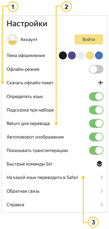 1 — офлайн-аударма үшін тілдік пакетті жүктеп алу 2 — енгізуді растау үшін тармақты ауыстыруға арналған пернені пайдалану 3 — Safari кеңейтімінің көмегімен сайттарды аудару үшін тілді таңдау |