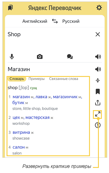 Словарные статьи отображаются под текстом перевода. Для некоторых языков сервис также подбирает: