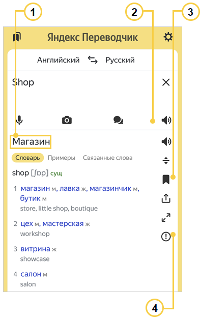 1 — Скопировать перевод. Нажмите текст перевода. Появится всплывающее сообщение Перевод скопирован. 2 — Озвучить текст. Чтобы изменить скорость озвучивания, нажмите кнопку 3 — Сохранить перевод. Текст будет автоматически добавлен в подборку Избранное. 4 — Сообщить об ошибке в переводе. Части перевода или словарной статьи будут выделены желтым, нажмите ту часть перевода или словарной статьи, в которой заметили ошибку. В появившемся окне опишите суть ошибки и нажмите Отправить. |