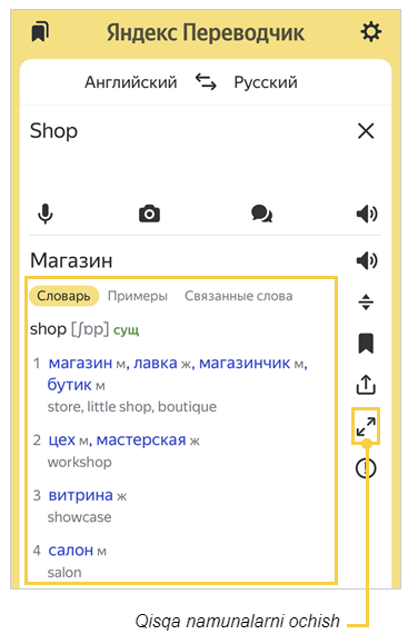 Lug‘at maqolalari tarjima matni ostida aks etadi. Baʼzi tillar uchun xizmat quyidagilarni ham tanlaydi: