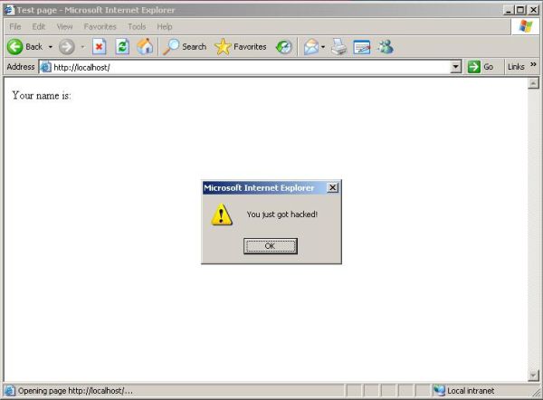 What happens if instead of a name you enter the following: «<script>alert («You just got hacked!») ;</script>»?